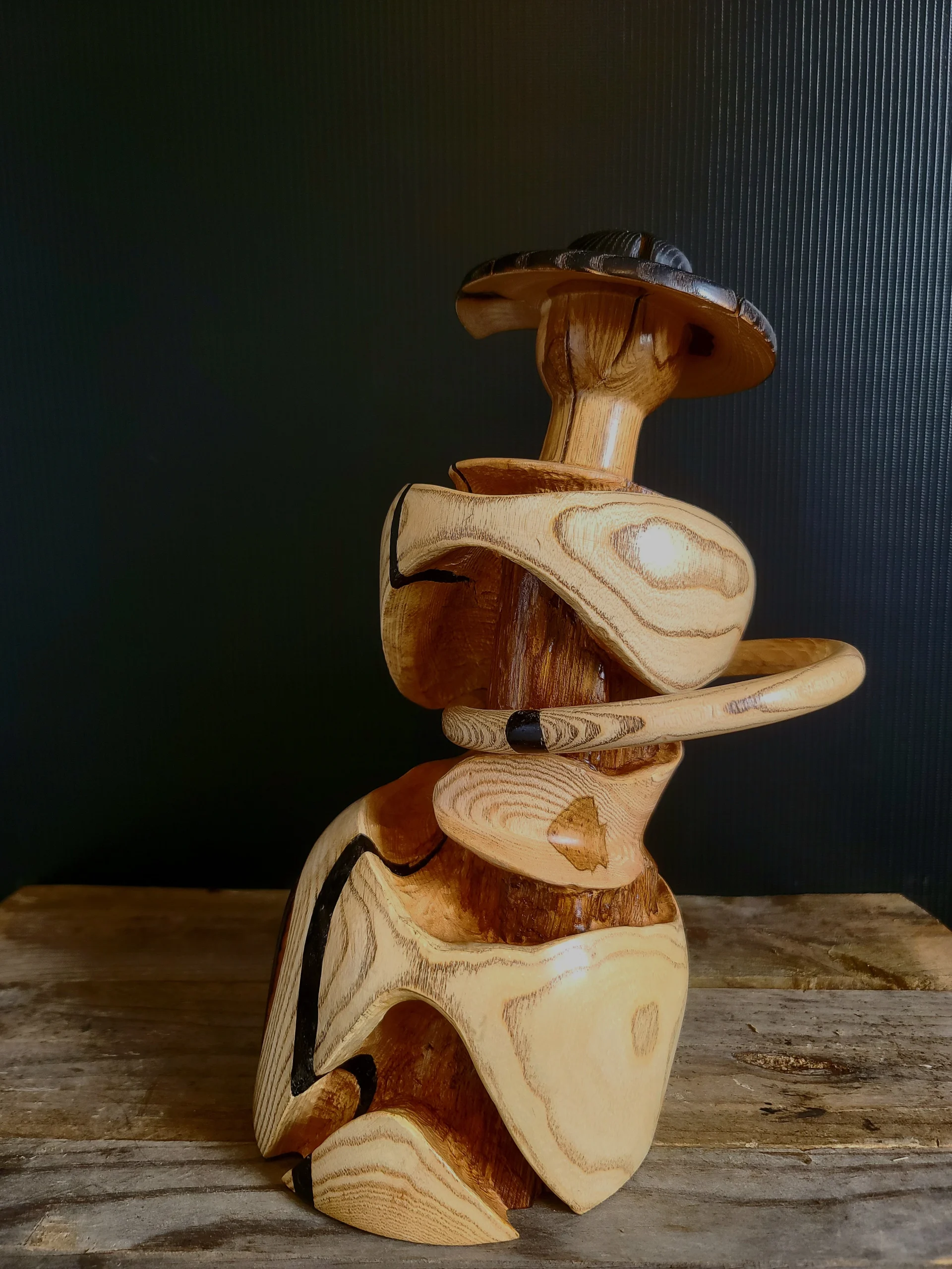 Bois de frêne tourné et sculpté. Un large anneau prisonnier fait office de cerceau et un chapeau en bois brûlé coiffe la tête.