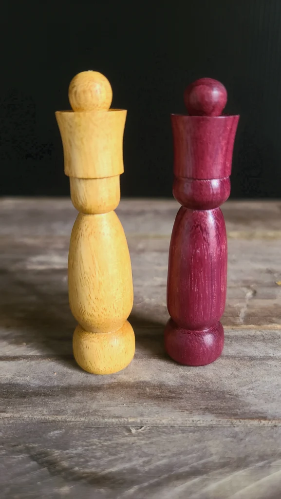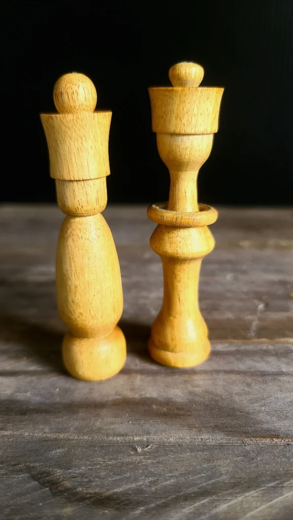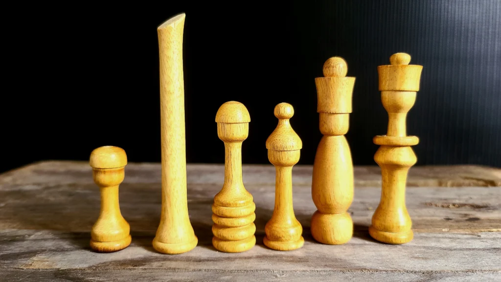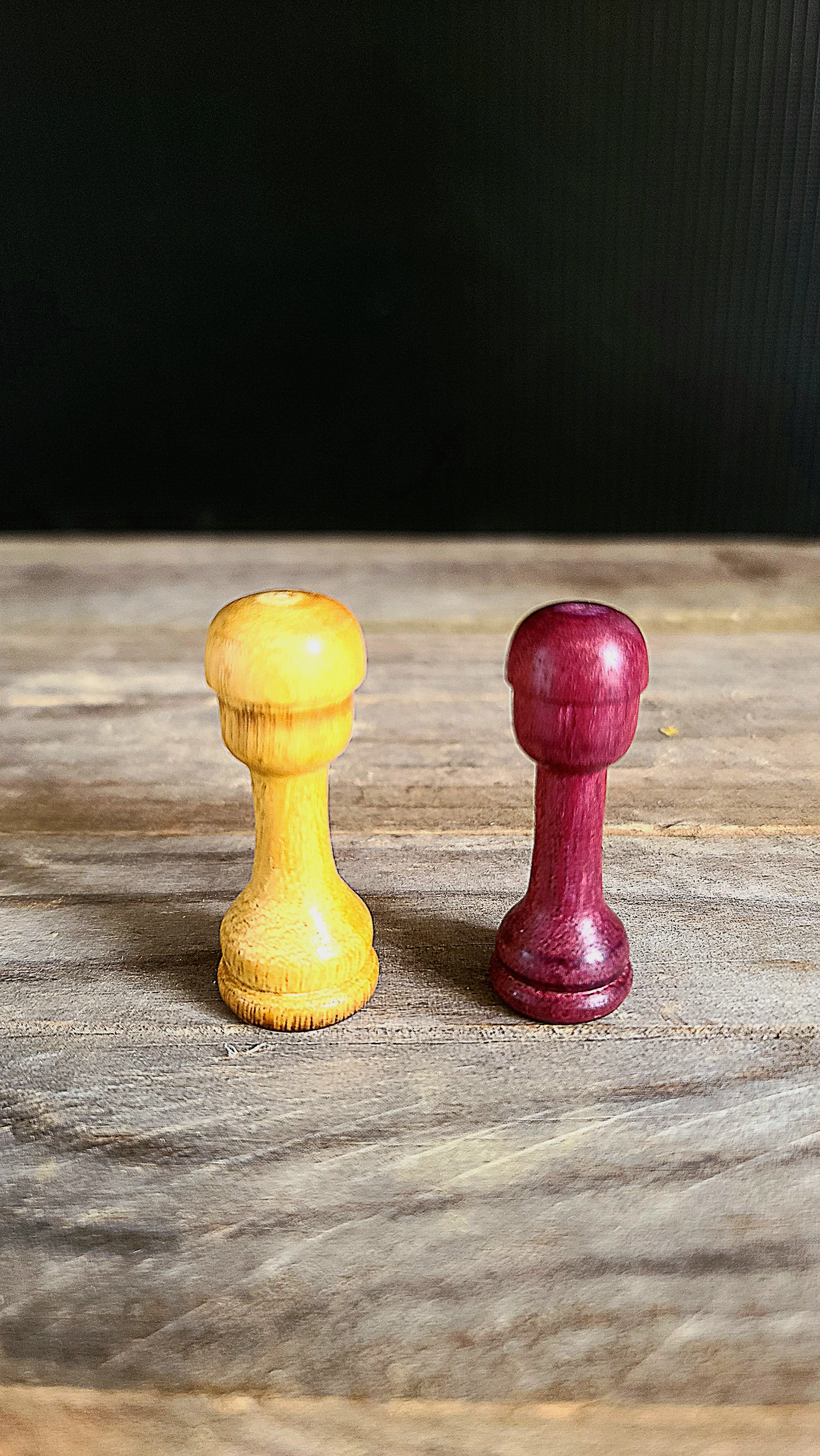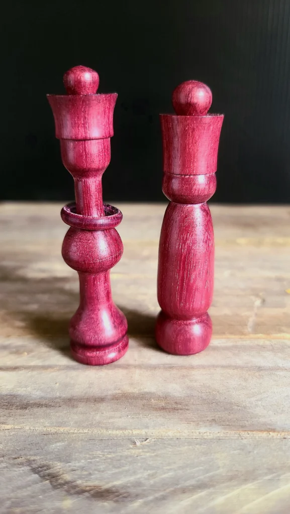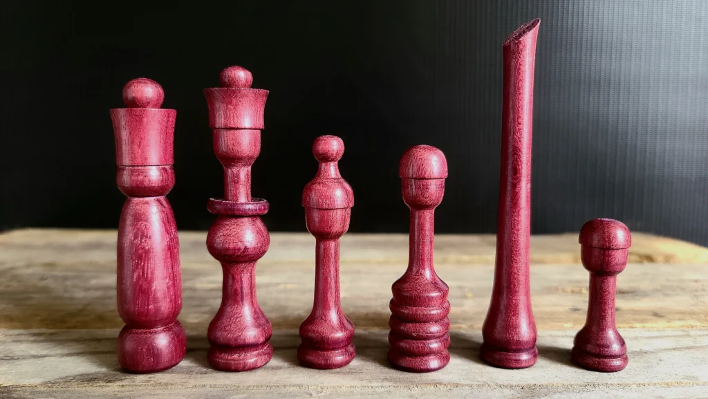 Un jeu d’échec en bois exotique.A gauche Movingui et à droite AmarantePlateau en marqueterie de chêne