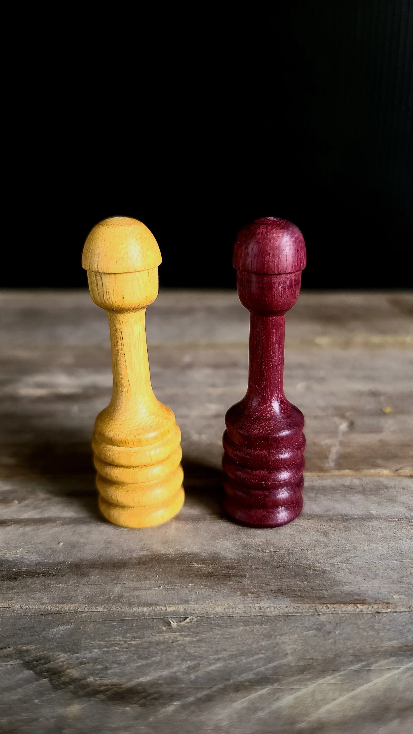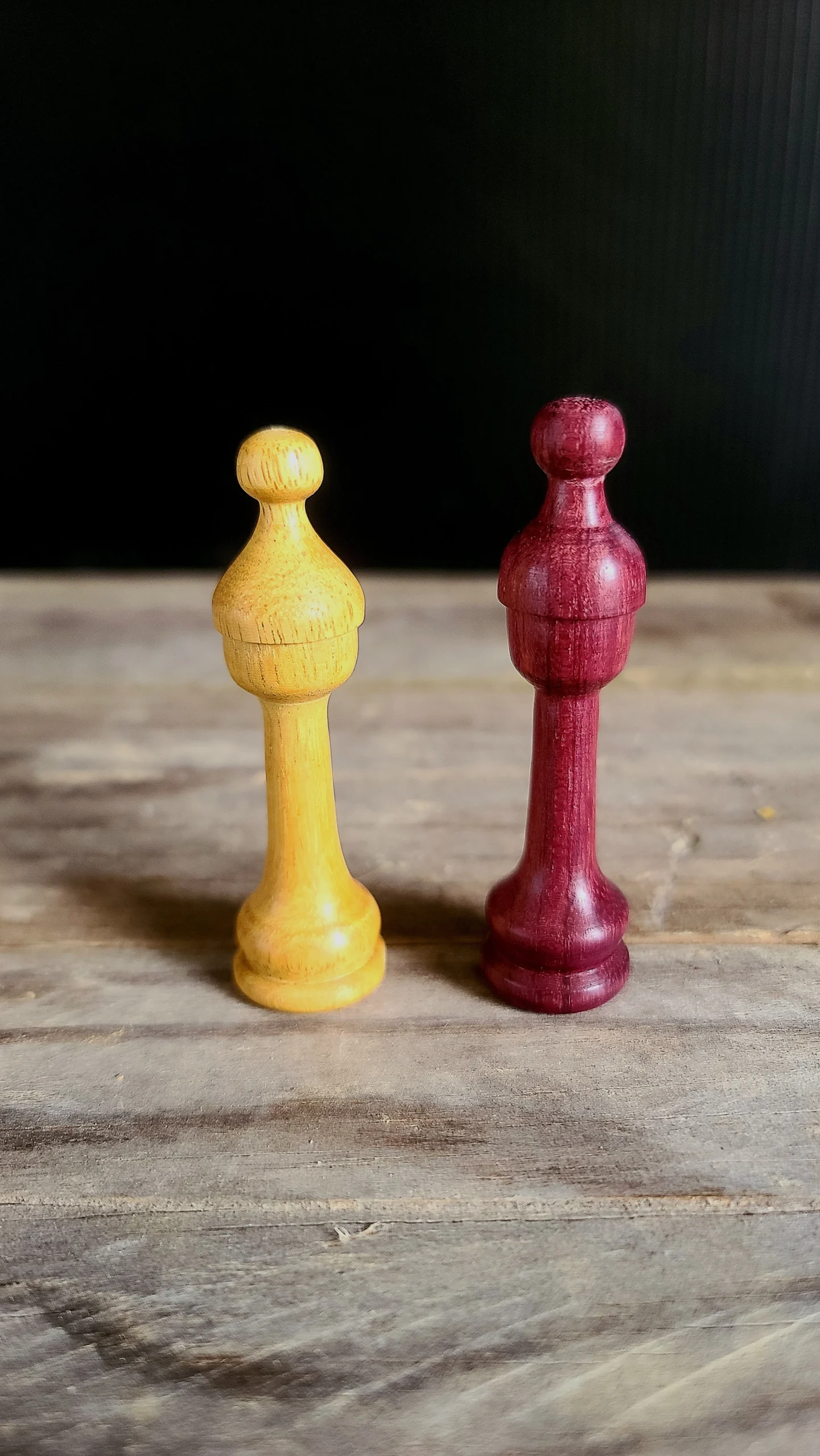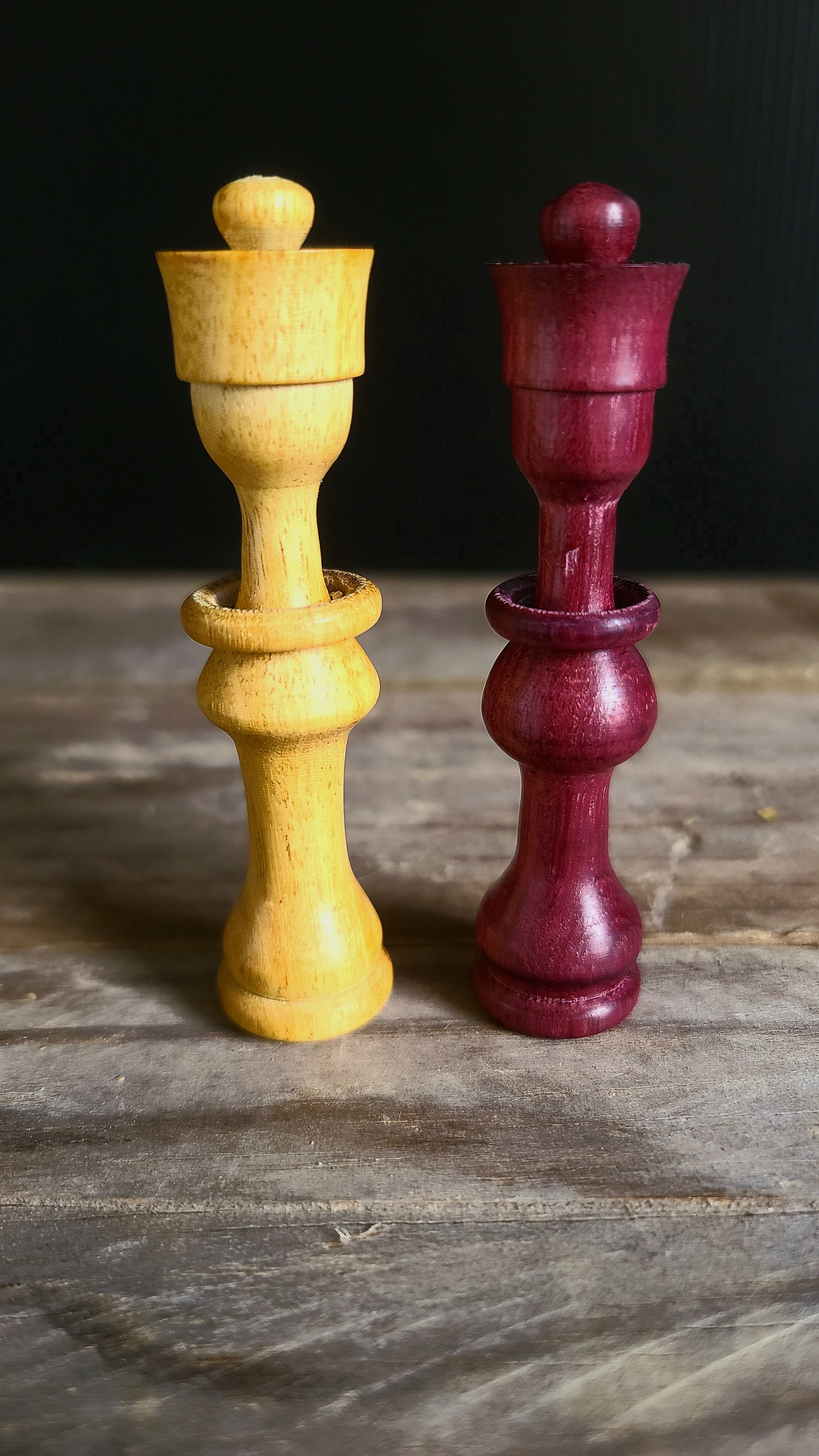 Un jeu d’échec en bois exotique.A gauche Movingui et à droite AmarantePlateau en marqueterie de chêne