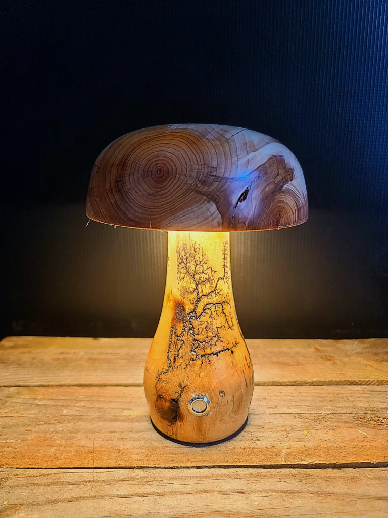 Le chapeau est en If et le pied en bois légèrement échauffé imprimé de fractales sur son tour.