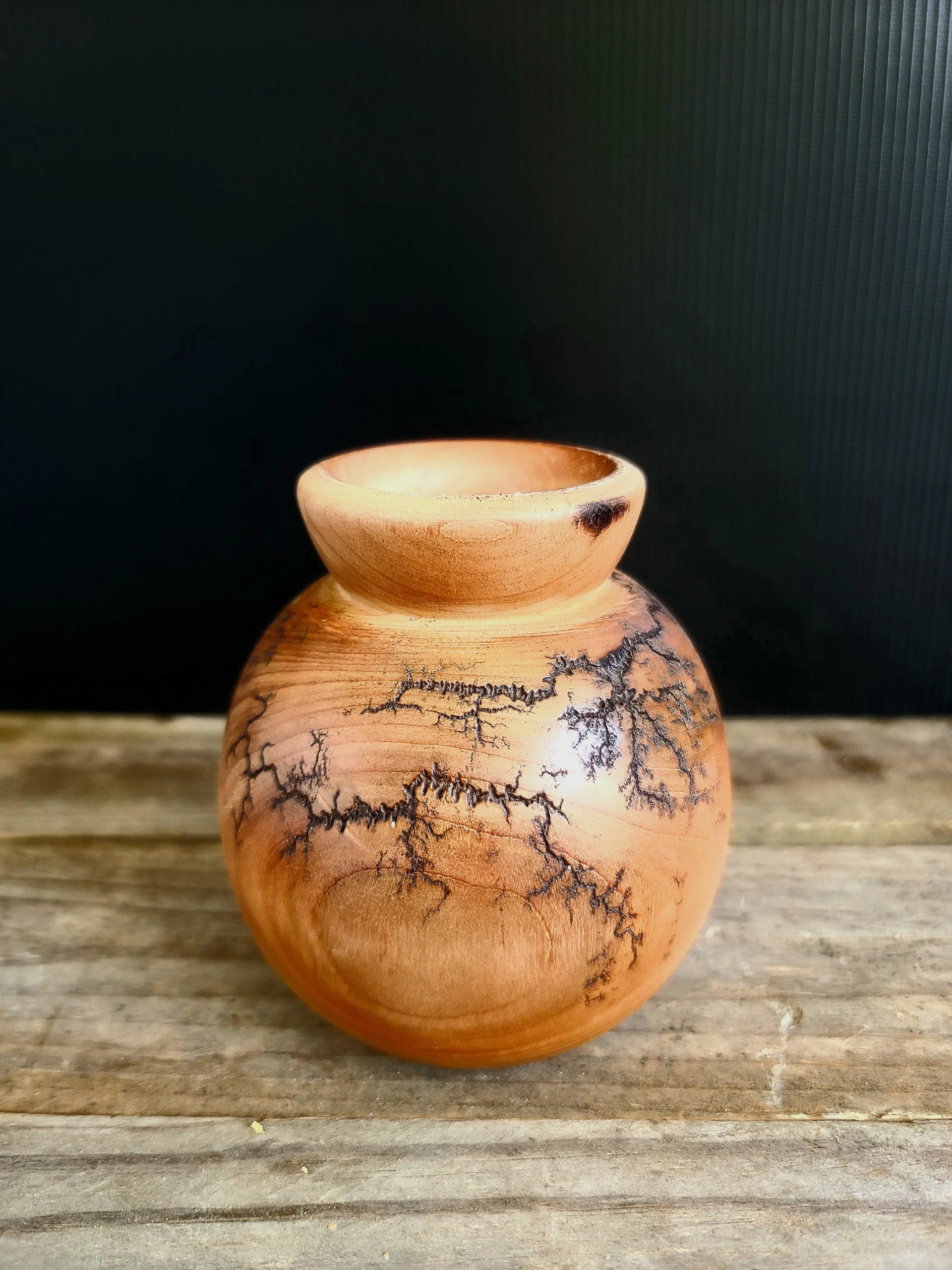 Un mini vase en Pommier tout en rondeur avec des fractales sur son tour.