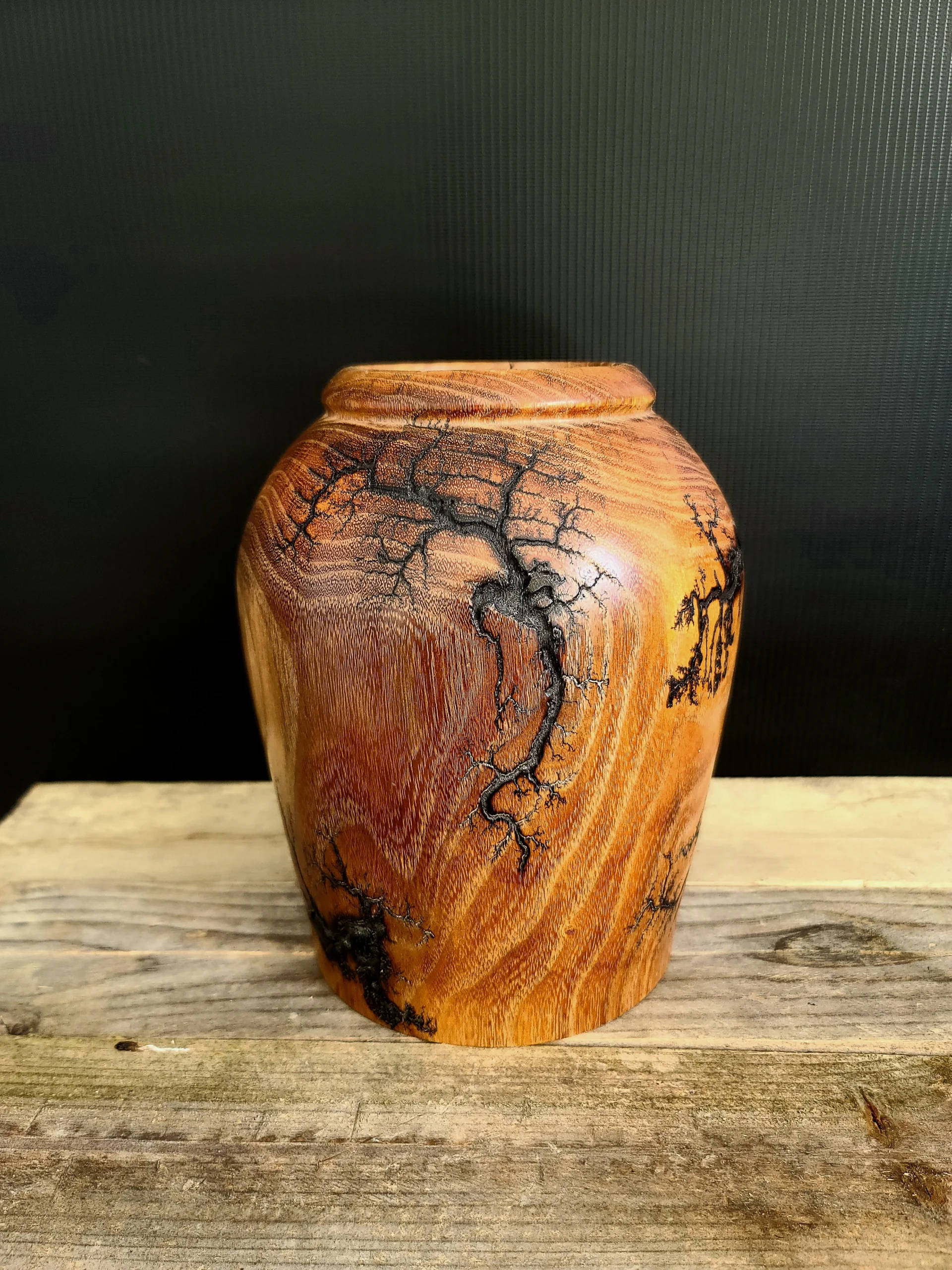 Un gros vase en Acacia tourné et imprimé de fractales sur son tour. A utiliser tel quel comme décoration, pour des bouquets de fleurs séchées ou avec un contenant (non fourni) pour accueillir vos bouquets de fleurs fraiches.