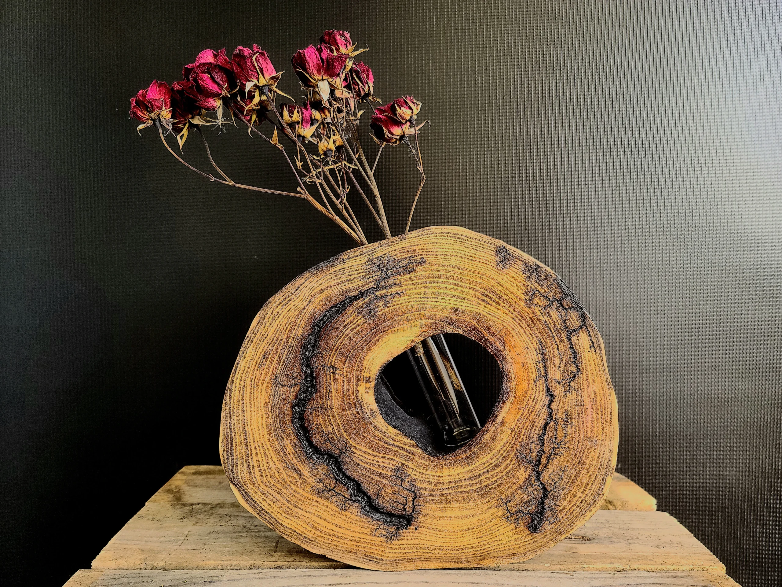 Une belle tranche d’acacia imprimée de fractales et intérieur brûlé.